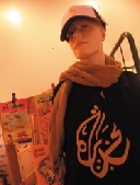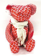 あのくまはこの展覧会のマスコットとして制作したものです。布地はサウジアラビアのもので、マフラーはアフガニスタン製、おまもりはパキスタン製です。名前は特にありませんが、先頃、亡くなったアラファト議長が生前よく身に着けていたターバンの柄にどことなく似ているので、「アラファトくん」とか「トラベリングベア」という愛称で呼んでいます。なお、今回の展覧会を開催するにあたり、企画の段階で「規範」として参考にした展覧会があります。昨年、ヴェニス、エジプト、レバノンなどの国際現代美術展で巡回展示された「現代アラブの表象展」がそれです。これは「同時代のアラブ社会をどのように表現するか」という問題に正面から取り組んだ大変意欲的な展覧会でした。絨毯をベンチにした展示はこの展覧会での展示を手本にしています。同じく、その展示では絨毯のペンチの上にアラビア風の柄のクッションが置かれていて、来場者がそこでくつろげるようになっていました。くまのぬいぐるみや抱き枕はこのクッションのアイデアをさらに「拡張」したもので、ただ手でふれるだけでなく、そのそばによりそい、抱きかかえていただくことで、アラビアにより親しみを感じていただければと願っています。 |