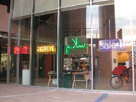 左から順に、中国語、ヒンディ語、アラビア語、インドネシア語、となっています。これらは、アジア・アフリカ言語文化研究所が研究している多くの言語のうち、アジアで特に広く使われている言語で、アラビア語で「あいさつ」と「平和」を意味する「サラーム」を各言語に翻訳したものです。今年度から国立大学法人となって、これからよりいっそう社会との関わりを深め、社会にむけて情報を発信してゆこうとするアジア・アフリカ言語文化研究所の姿勢を示すものとして、外にむかってひらかれたラウンジに展示しています。 |