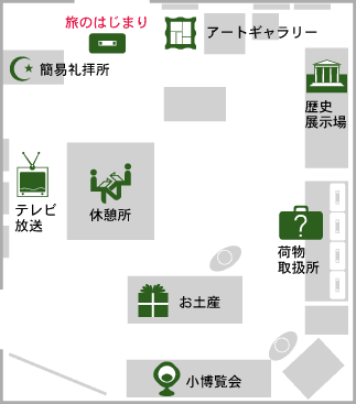 架空の空港のトランジット・ラウンジのようなつくりになっています。アラビア文字の国を旅する旅行者になった気分で空港内の施設をご覧下さい。では、どうぞ、すてきな旅を